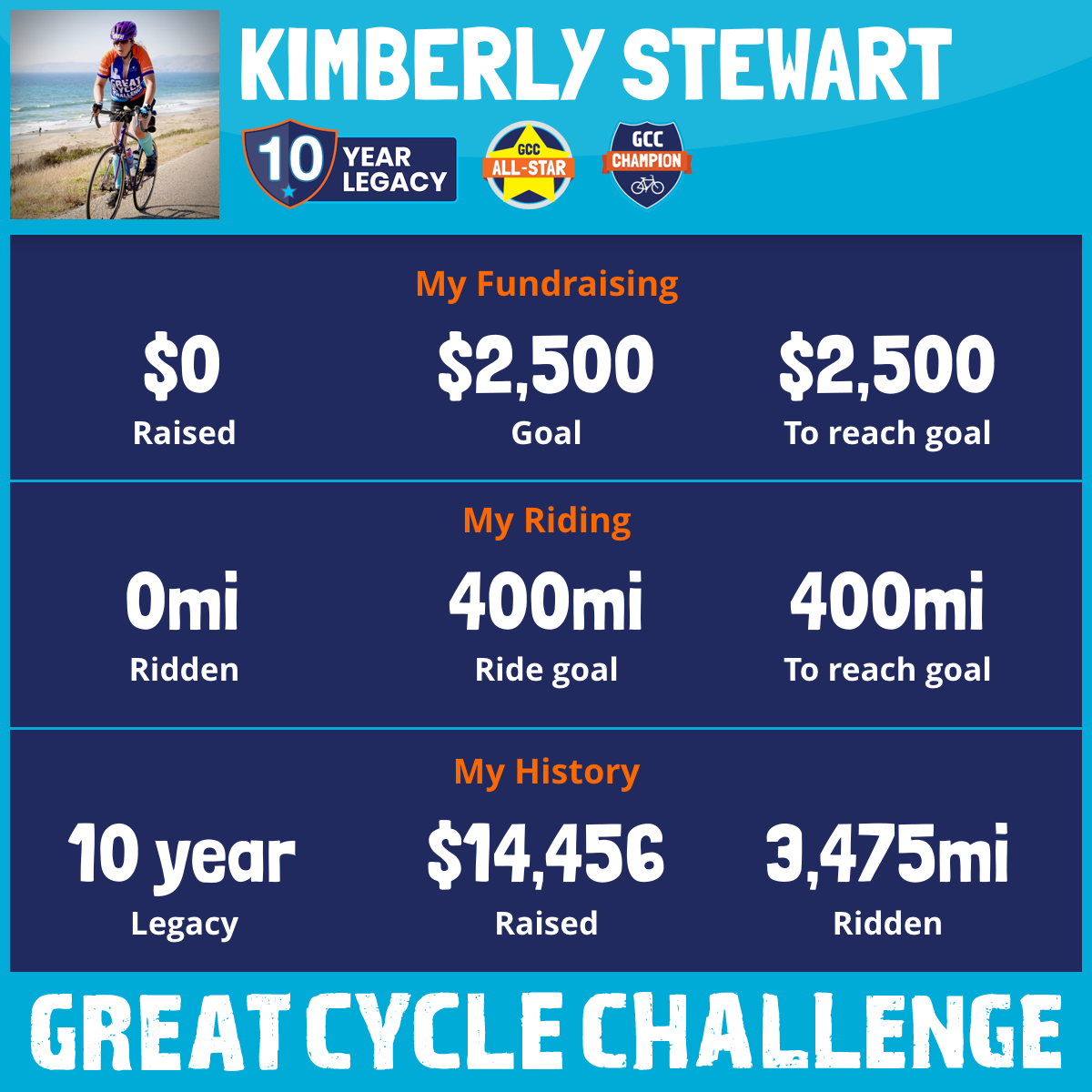 I’m so excited and up for the challenge of riding 400 miles in this year’s Great Cycle Challenge!