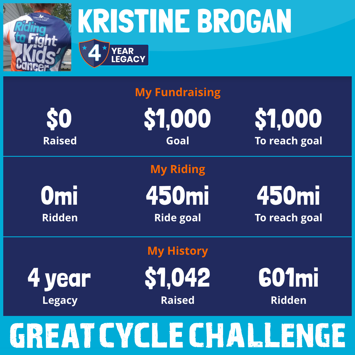 I am riding 450 mi to fight kids' cancer and save little lives. Please sponsor me to support my challenge!