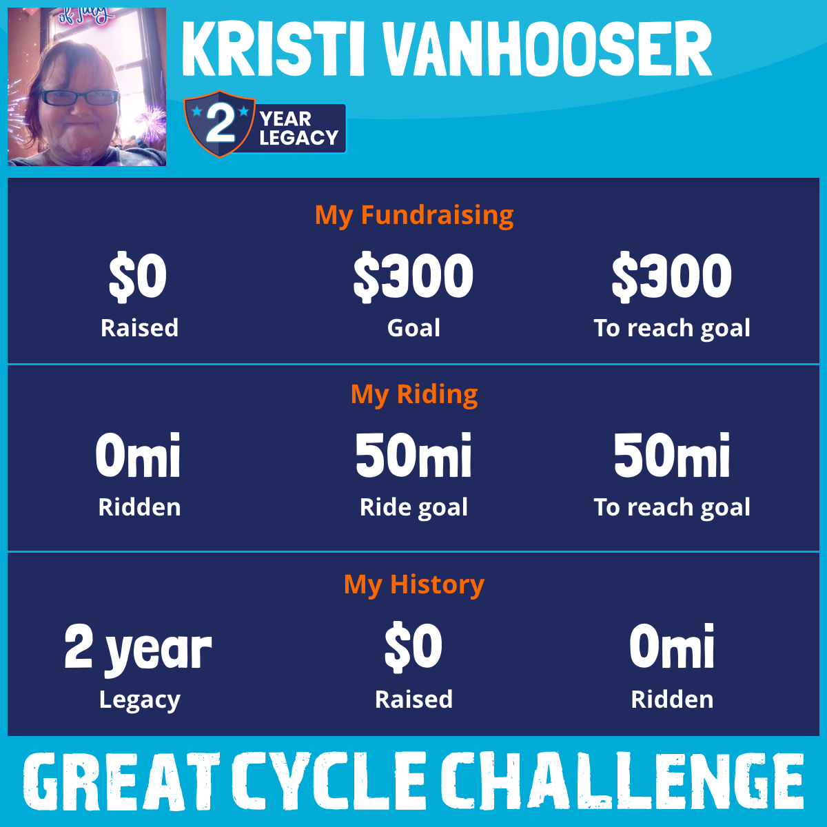 I am riding 50 mi in memory of my loved one, Chris Small. Please sponsor me and support my challenge to fight kids' cancer and save little lives.
