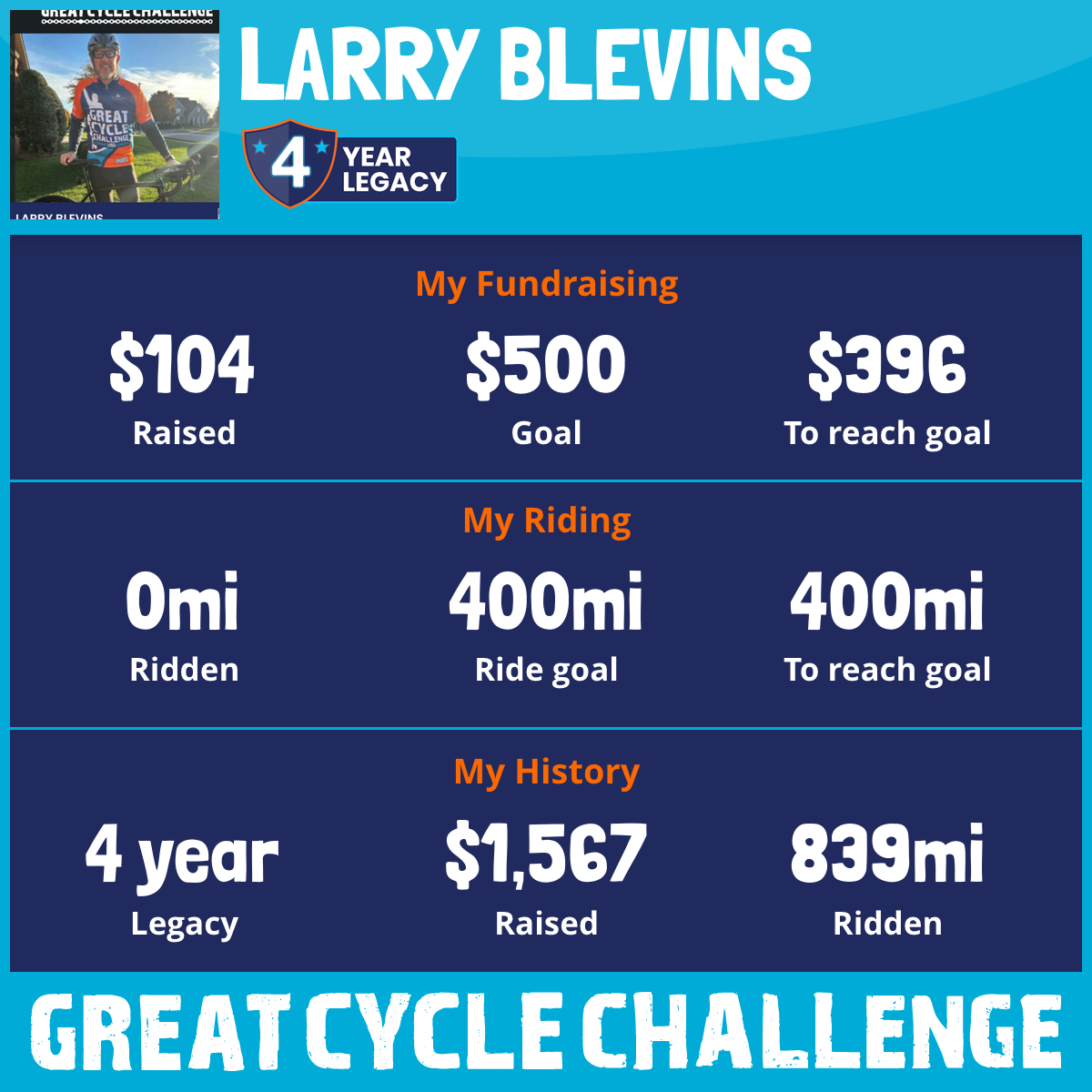 This is my 4th year taking part in the Great Cycle Challenge to fight kids' cancer! I have raised the goal in all the previous years and this year I am starting with 300 mi. being my target.