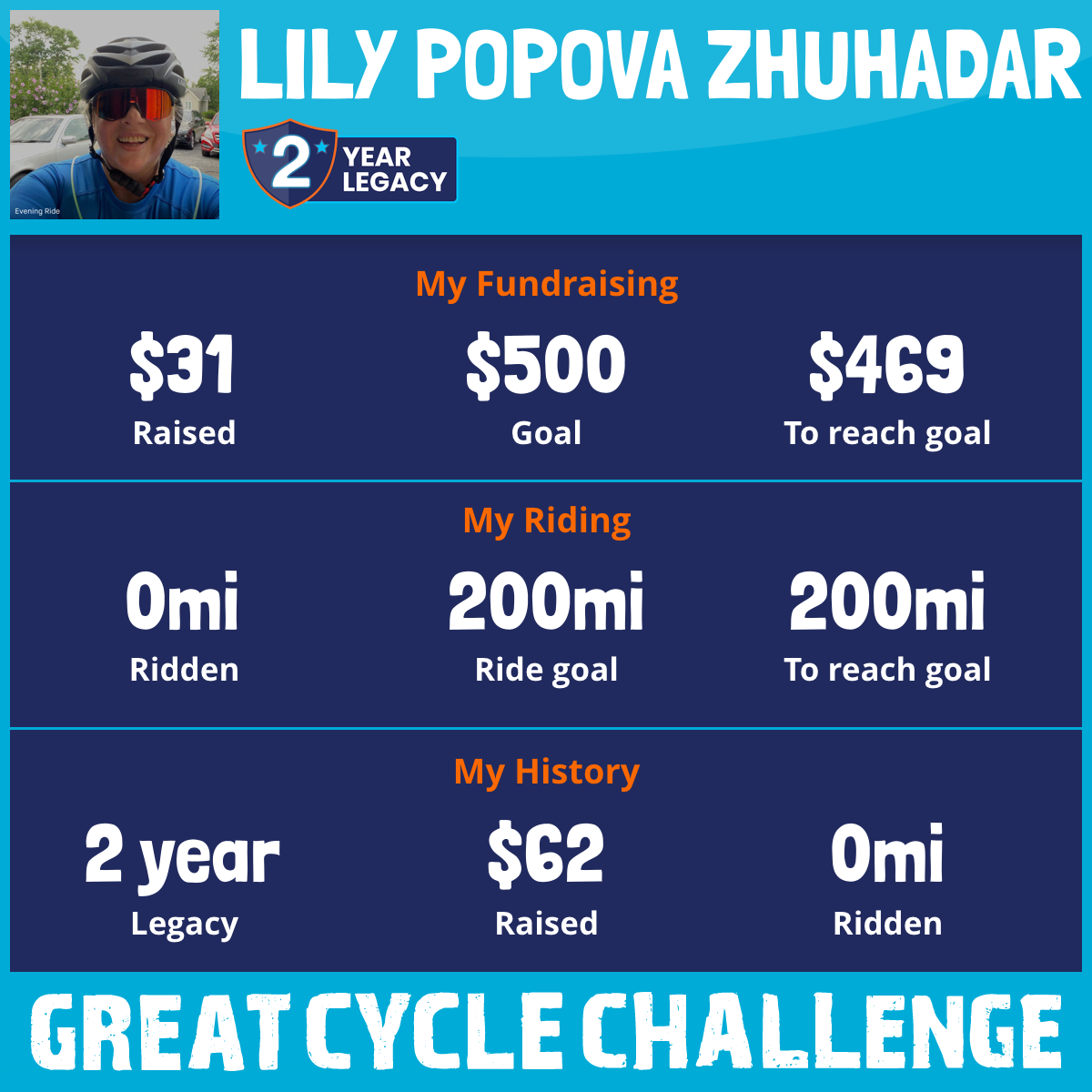 I am riding 200 mi in memory of Christian Popova. Please sponsor me and support my challenge to fight kids' cancer and save little lives.
