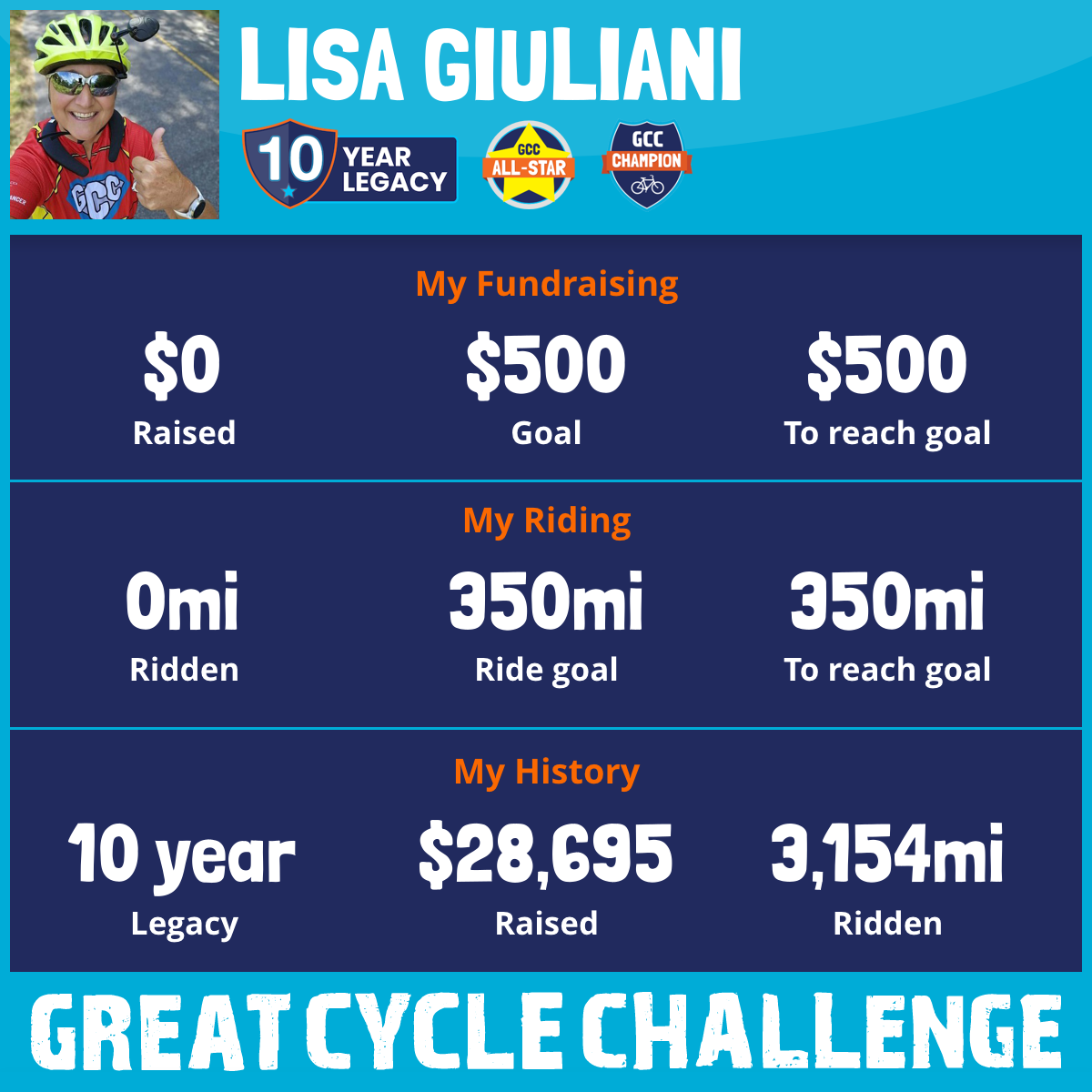 This September, for the 10th year in a row, I am taking part in the Great Cycle Challenge to fight kids' cancer! Great Cycle Challenge started in 2015, and after just 10 years, the event has grown to become one of the biggest cycling events in the United States. In 10 years, our community of riders from all 50 states has ridden a total of 33,817,103 miles, and together we’ve raised $72,646.876 in support of research to develop better treatments and find a cure for childhood cancer. Although I did not participate in 2015, over the past 10 years, I have ridden 3,154 miles, and with the help of family, friends, and neighbors, I have raised $28,818.70 for the Children's Cancer Research Fund. This year, my mileage goal is 350 miles, and my financial goal is $2,000 to reach and surpass $30,000 raised over the 10 years I've been a participant. Will you help me reach my financial goal? I'll take care of the miles and my own donation on Match Day, to be announced.