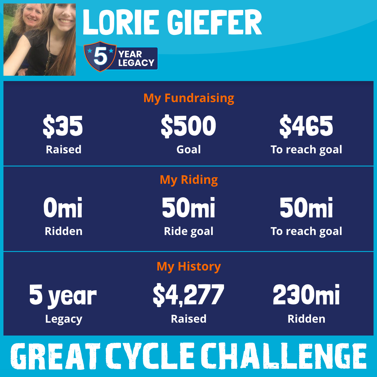I am riding 50 mi in memory of Heather Giefer. Please sponsor me and support my challenge to fight kids' cancer and save little lives.