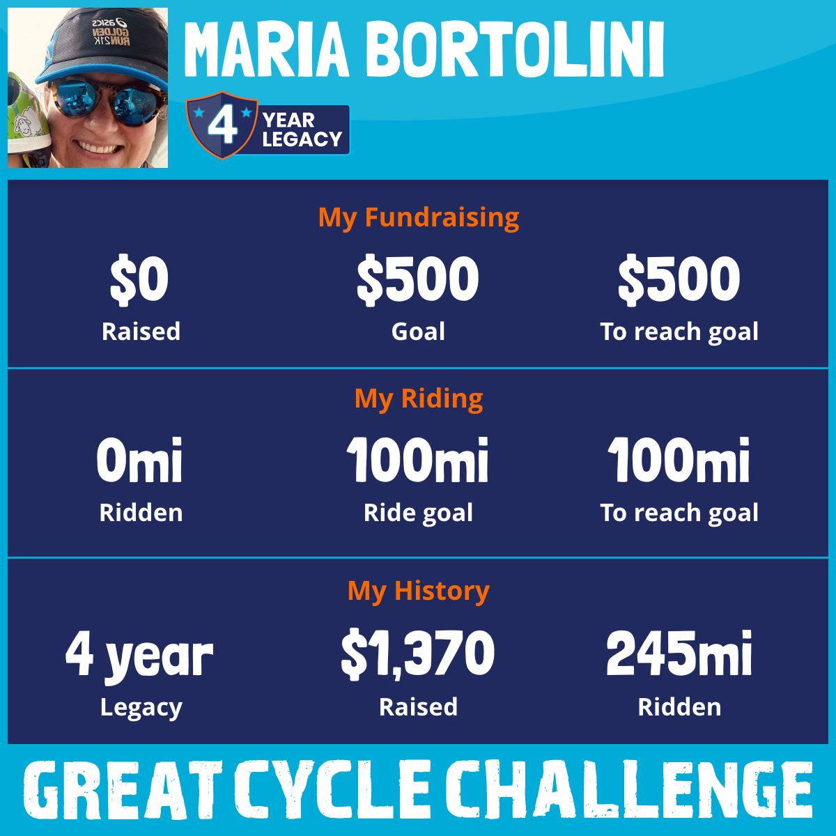 I am riding 100 mi in memory of my loved one, Marli, Debora, Marina, Ana Maria, Babico, Doris. Please sponsor me and support my challenge to fight kids' cancer and save little lives.