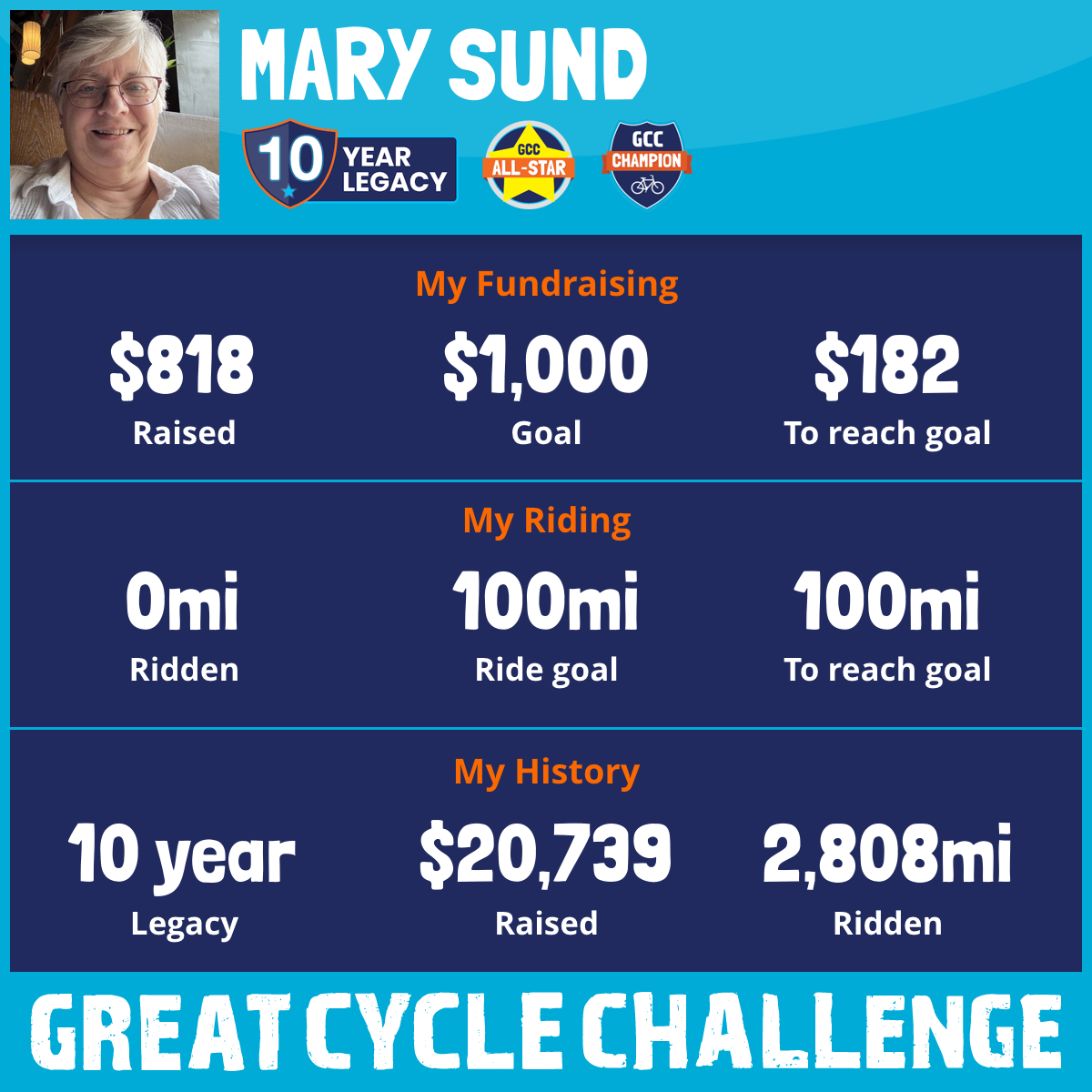 This year, I am riding on my exercise bike. I fell in July and broke my right wrist and didn’t realize it was broken for a few weeks, so now it will be in a splint and I can’t safely ride my bike outside. But I am still determined to put in the miles and raise the money for children’s cancer .