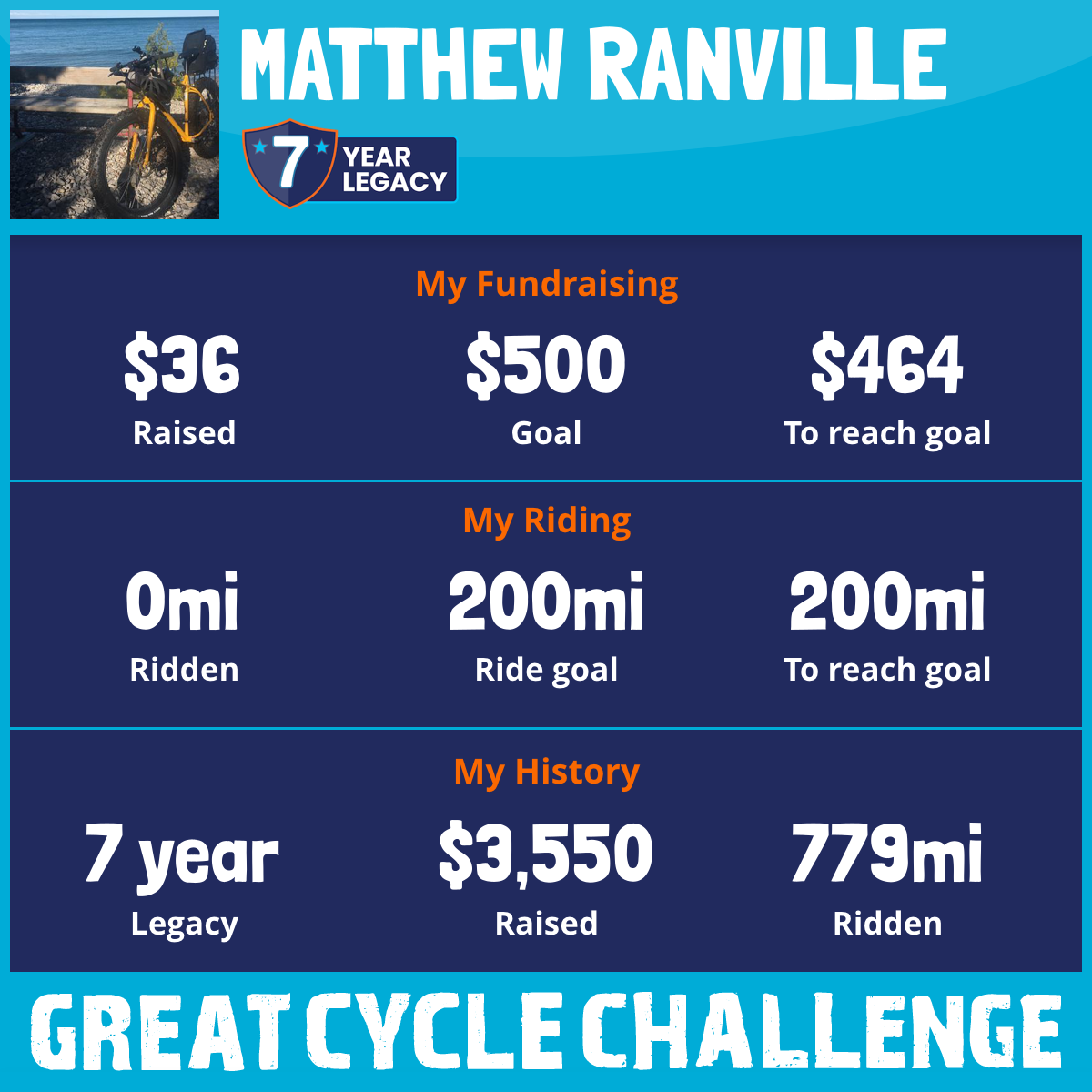 I am raising funds through my challenge to help these kids and support Children's Cancer Research Fund to allow them to continue their work to develop lifesaving treatments and find a cure for childhood cancer. I am riding in memory of my grandmother, who died after a battle with cancer, and for all the friends who died or were impacted by it.