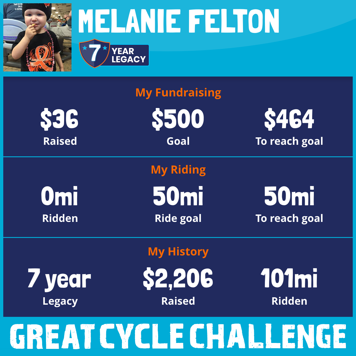 I am riding in memory of my granddaughter, Amelia. She battled leukemia twice including chemo induced brain trauma where she had to learn to walk, talk and eat again. Her fight ended when she went to dance with Jesus in March 2019. We miss her like crazy and want to support pediatric cancer research to help our little ones win their battles!