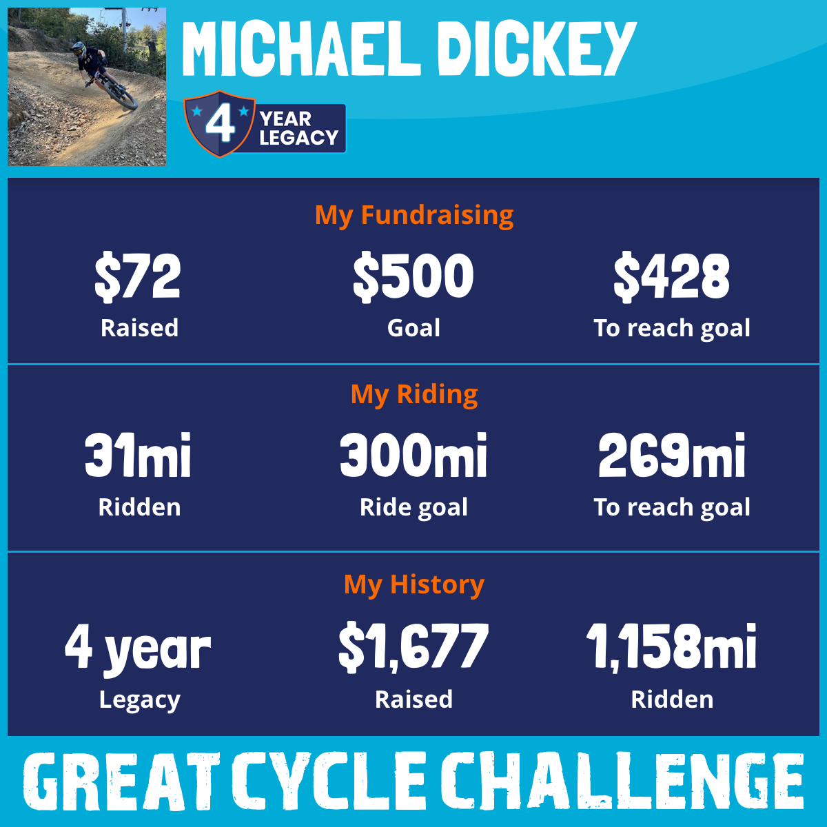 I am riding 300 mi in memory of Daniel Dickey Sr. Please sponsor me and support my challenge to fight kids' cancer and save little lives.