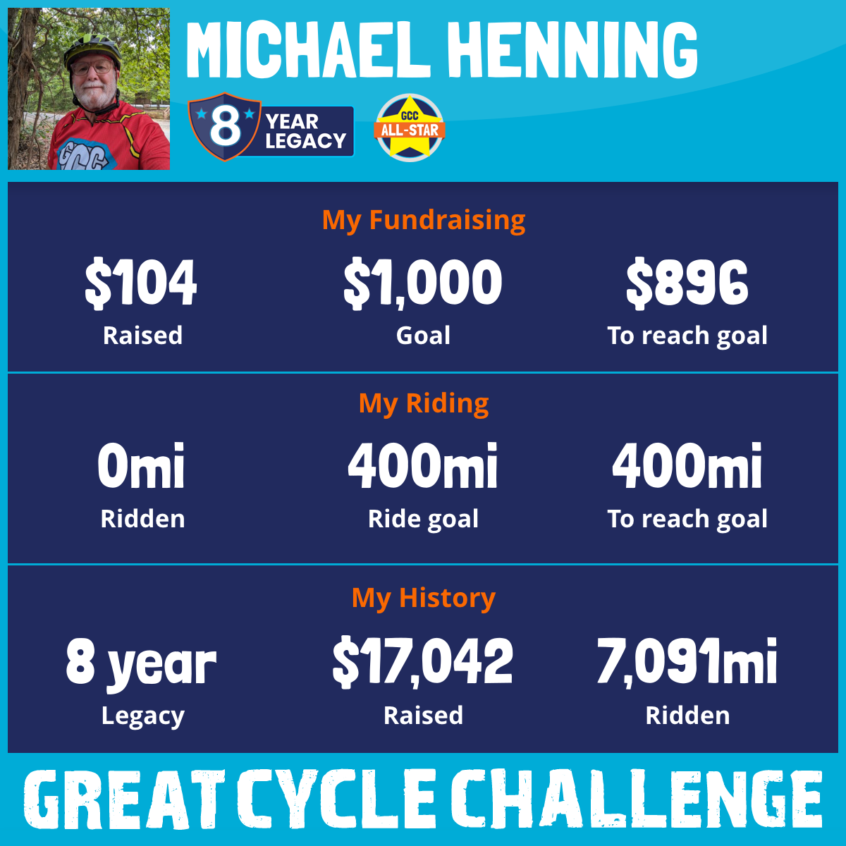 My eighth consecutive Great Cycle Challenge is complete, and goals accomplished. I would have been riding anyway so it is my supporters that deserve the credit.
