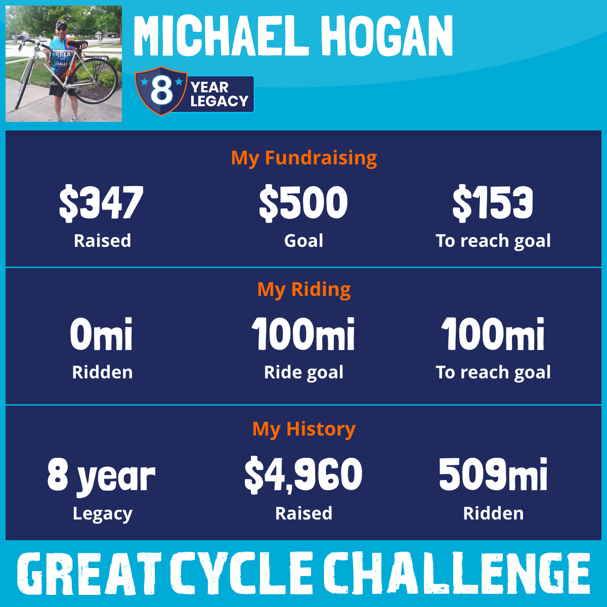 This September, I am taking part in the Great Cycle Challenge to fight kids' cancer! This is my sixth year. Unfortunately, this year I will be doing my low mileage riding on an exercise bike due to recent hip replacement surgery.