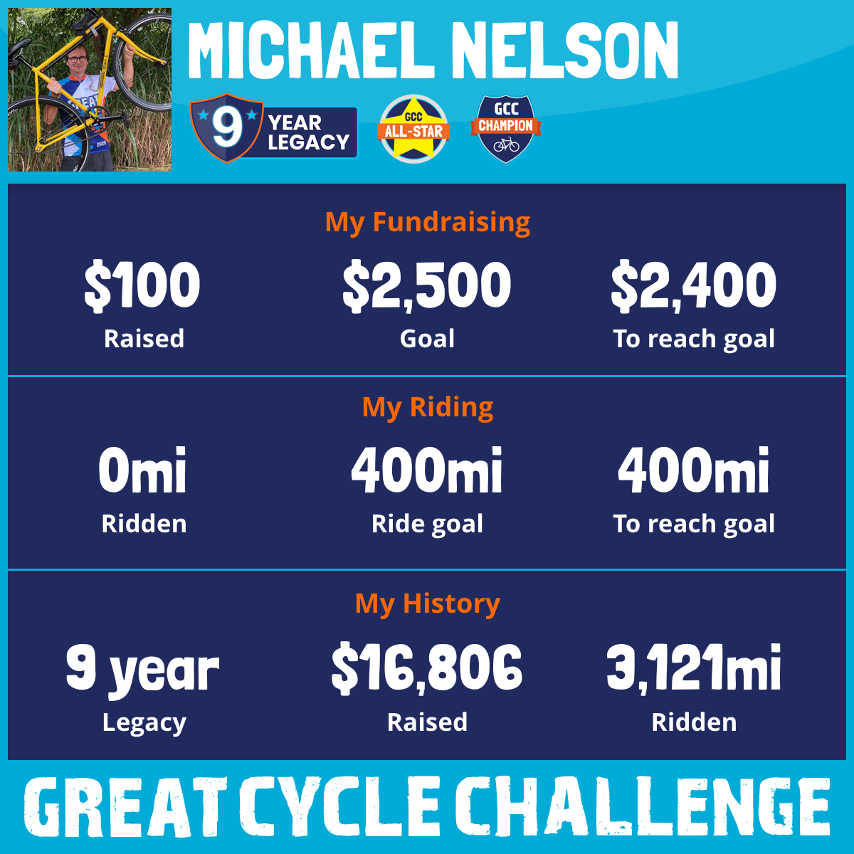 This is my 9th consecutive year participating in the Great Cycle Challenge, raising funds to fight childhood cancer. Proceeds support the Children's Cancer Research Fund to help continue the work to develop lifesaving treatments and to help find a cure for childhood cancer. For details on this charity see: https://childrenscancer.org/