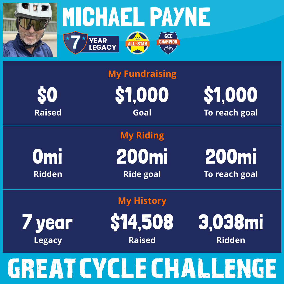 I heard about this opportunity from a co-worker in Florida over 7 years ago and thought it would be an excellent chance to combine my love for riding and an extremely important and worthy cause. Because whether for children or adults, advancements toward this cause affects EVERYONE that has been touched by this terrible disease! This September, I am taking part in the Great Cycle Challenge to fight kids' cancer!