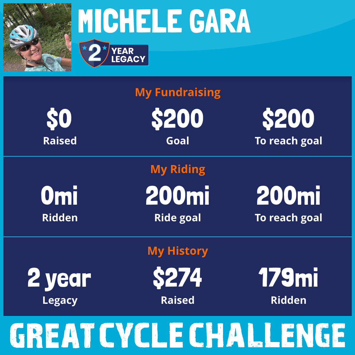 I am riding 350 mi in memory of my loved one, Dolores Mae Gara; Michael Gara; Sharrie Grady; Bob Grady; Deidy Forte; Margaret Wrydra. Please sponsor me. Thanks!