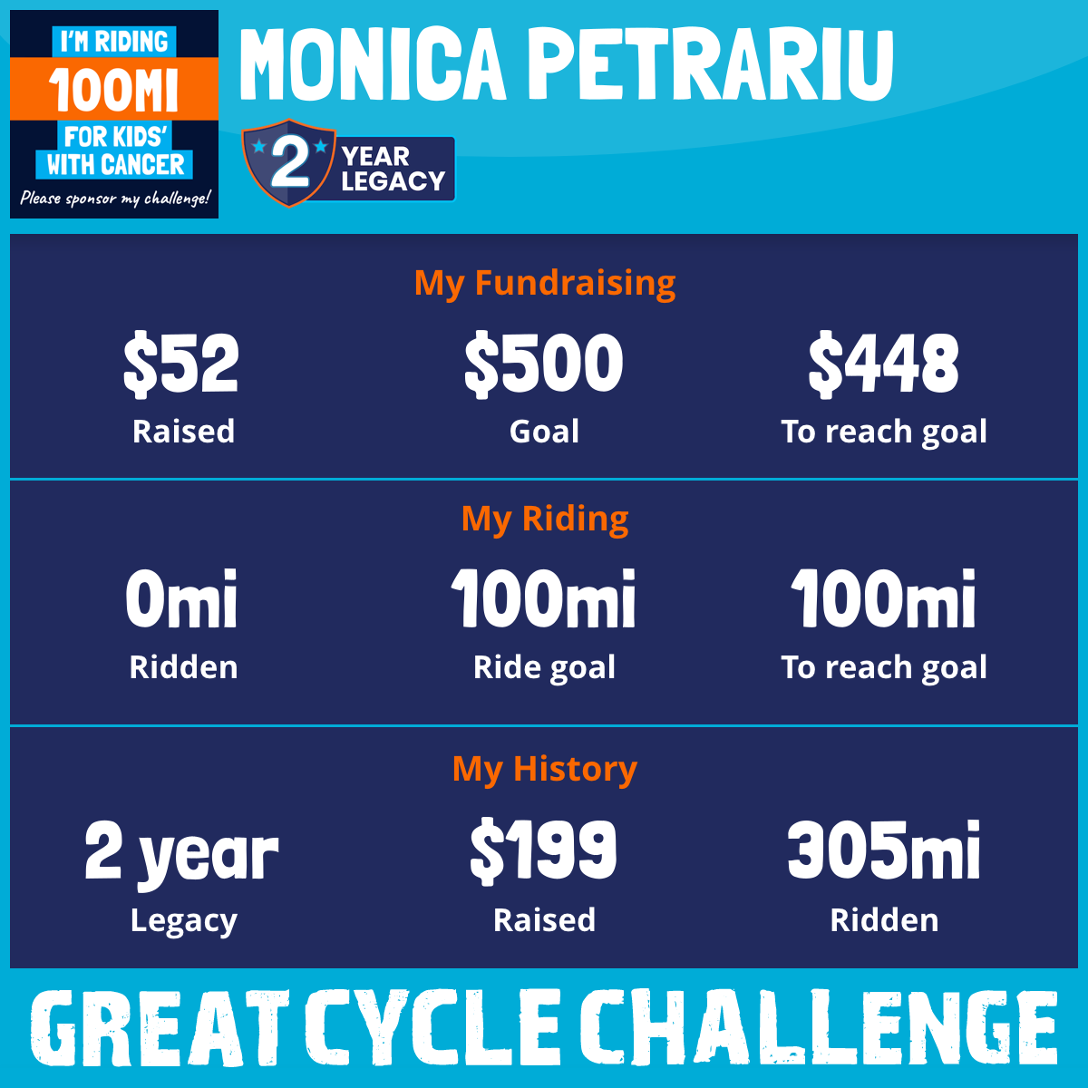 I am riding 100 mi to fight kids' cancer and save little lives. Please sponsor me to support my challenge!