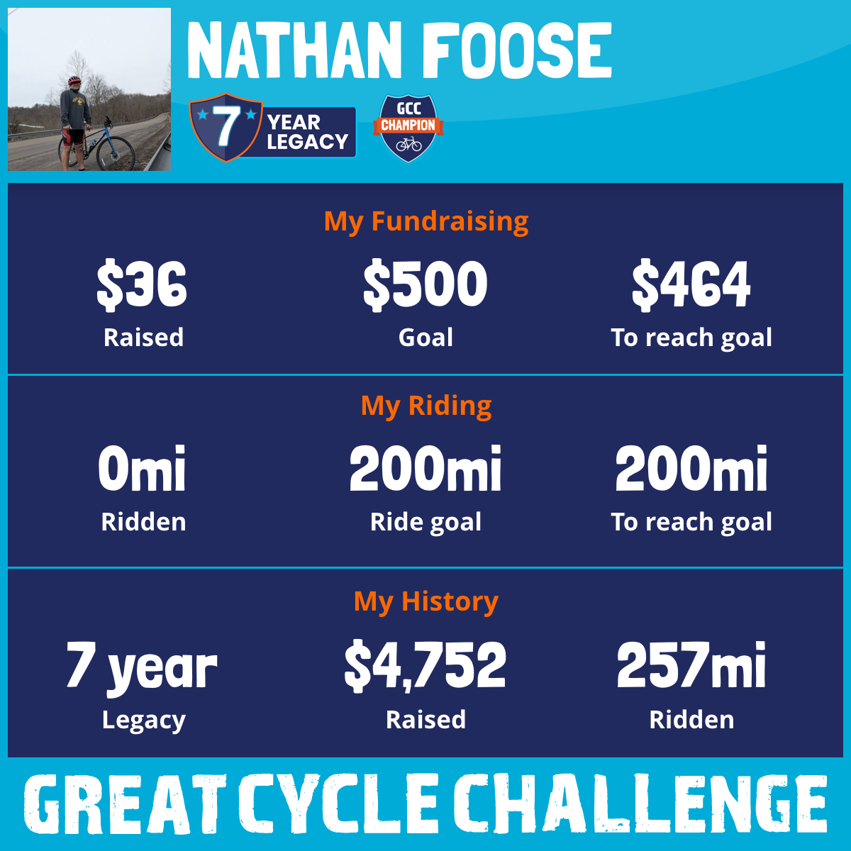 My name is Nathan Foose, and this is my 6th year riding for Childrens cancer. I have raised over $4,600 in 5 years and this year i want to raise over $2,000. Last year I had the best 1-day bike trip of 152 miles in 11 hours, Bike trip was very hard but it's nothing compared to the pain these kids are going through. This year i have a big 1-day challenge of a 1 day 200-mile bike trip to support children that are suffering. Please need your help for a child in need of treatment and research. Please join the fight for kids' cancer by donating to a great cause.