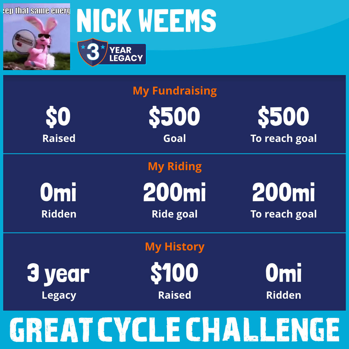 I am riding 200 mi for Weems. Please sponsor me and support my challenge to fight kids' cancer and save little lives.
