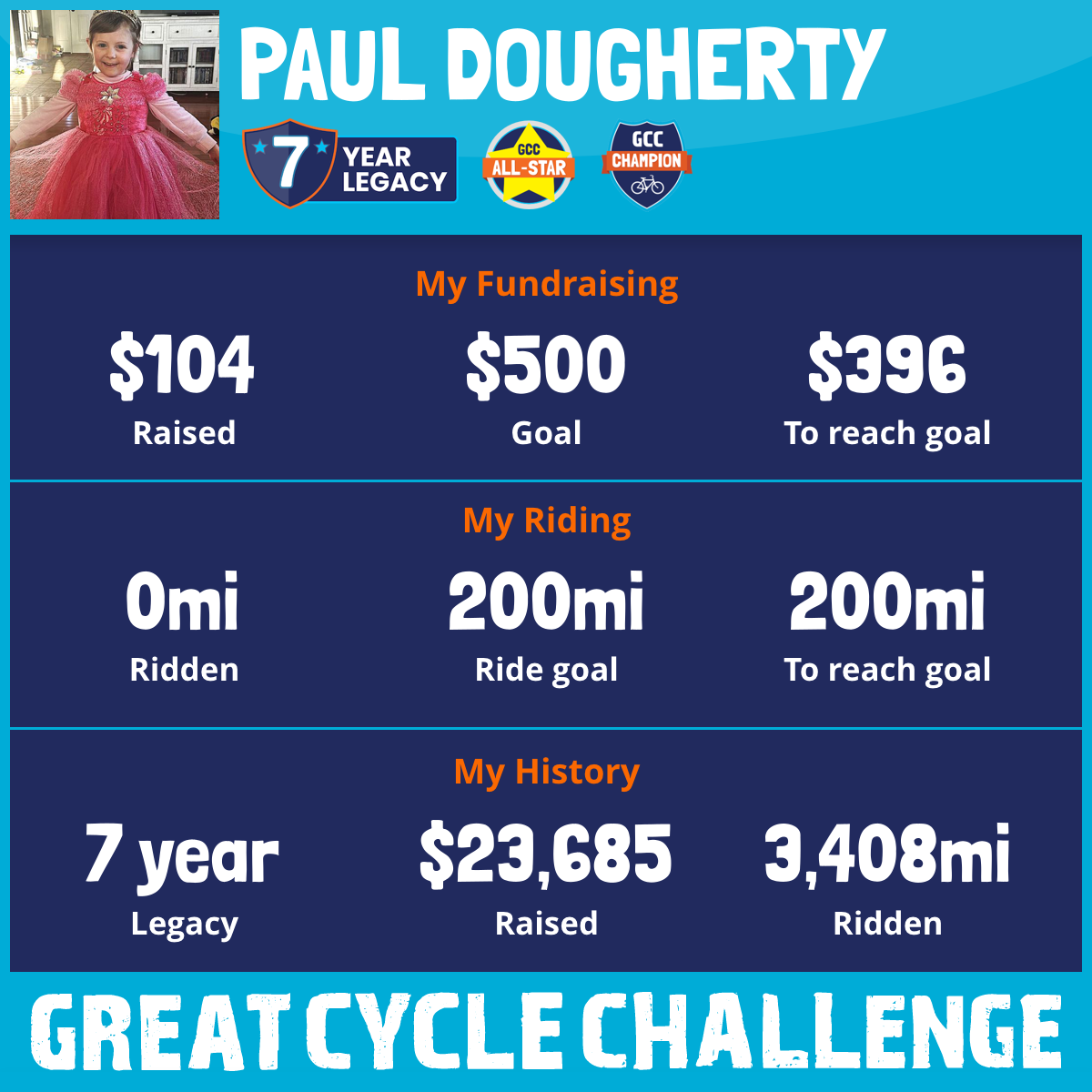 I will be riding in The Great Cycle Challenge in honor of 6 year old Stella Waltemire. Stella was diagnosed with standard risk B cell ALL (acute lymphocytic leukemia) on 3/1/2021! Doctors thought that she had beat cancer but it returned in December of 2023, just a few days before Christmas. Stella had a bone marrow transplant from her 6 year old brother last April. I am happy to report that even though it was touch and go for a while last year - Stella is thriving now! We have a lot more work to do! I am asking if anyone out there can help by donating to the Childhood Cancer Research Fund! Thanks to all that have helped me the past 6 years! God Bless! Your donations fund cancer research and helps develop new childhood cancer treatments with less toxic drugs to fight this rotten disease! We will do anything in our power to help bring that change to fruition. I am here to do my part to raise money for childhood cancer research and I hope my friends and family will do their part by donating to this cause! My dream is that we can find a cure for Stella's cancer and all the other children fighting cancer! Thank You!