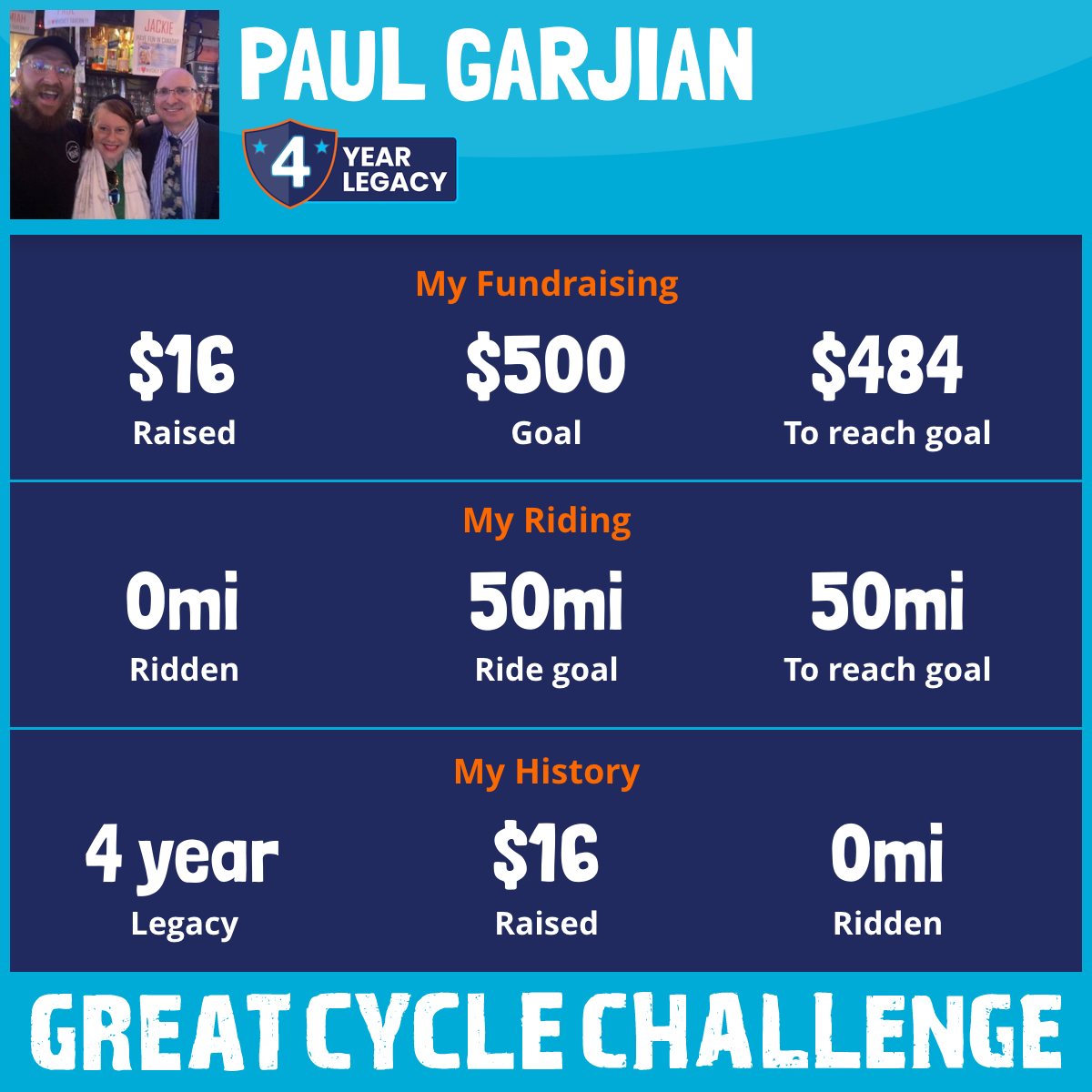 I am riding 50 mi in memory of my dad, George. Please sponsor me and support my challenge to fight kids' cancer and save little lives.