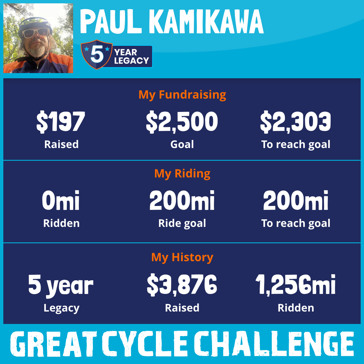Thanks for all who have contributed in the past and consider again this year. I have upped my dollar goal this year, $2,500. I welcome new patrons and this year I am riding with increased purpose and spirit.