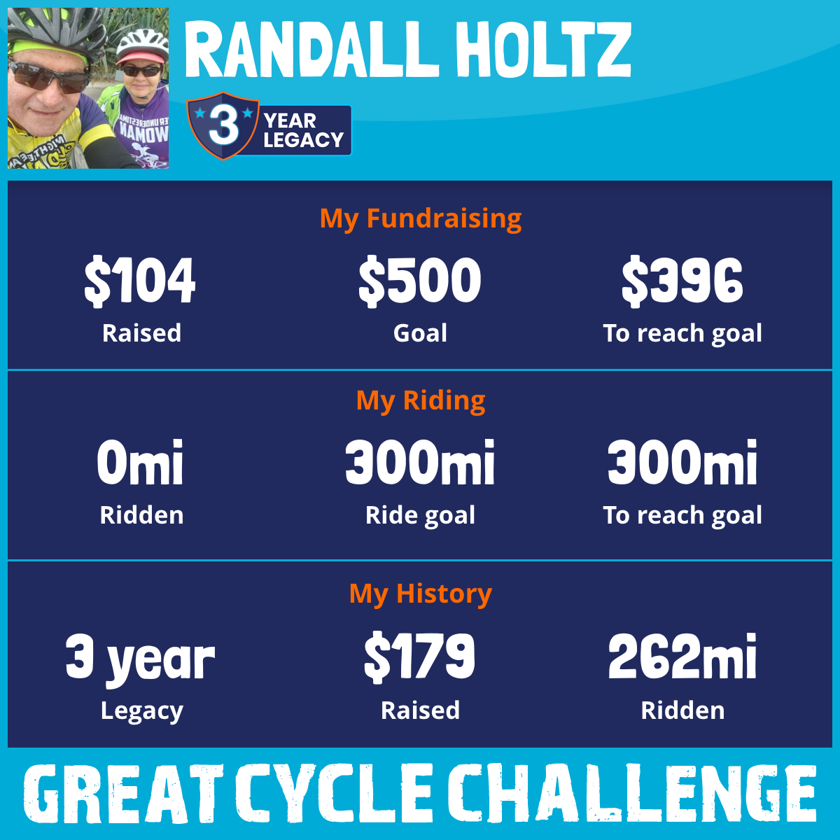 I am riding 300 mi for Randall Holtz. Please sponsor me and support my challenge to fight kids' cancer and save little lives.