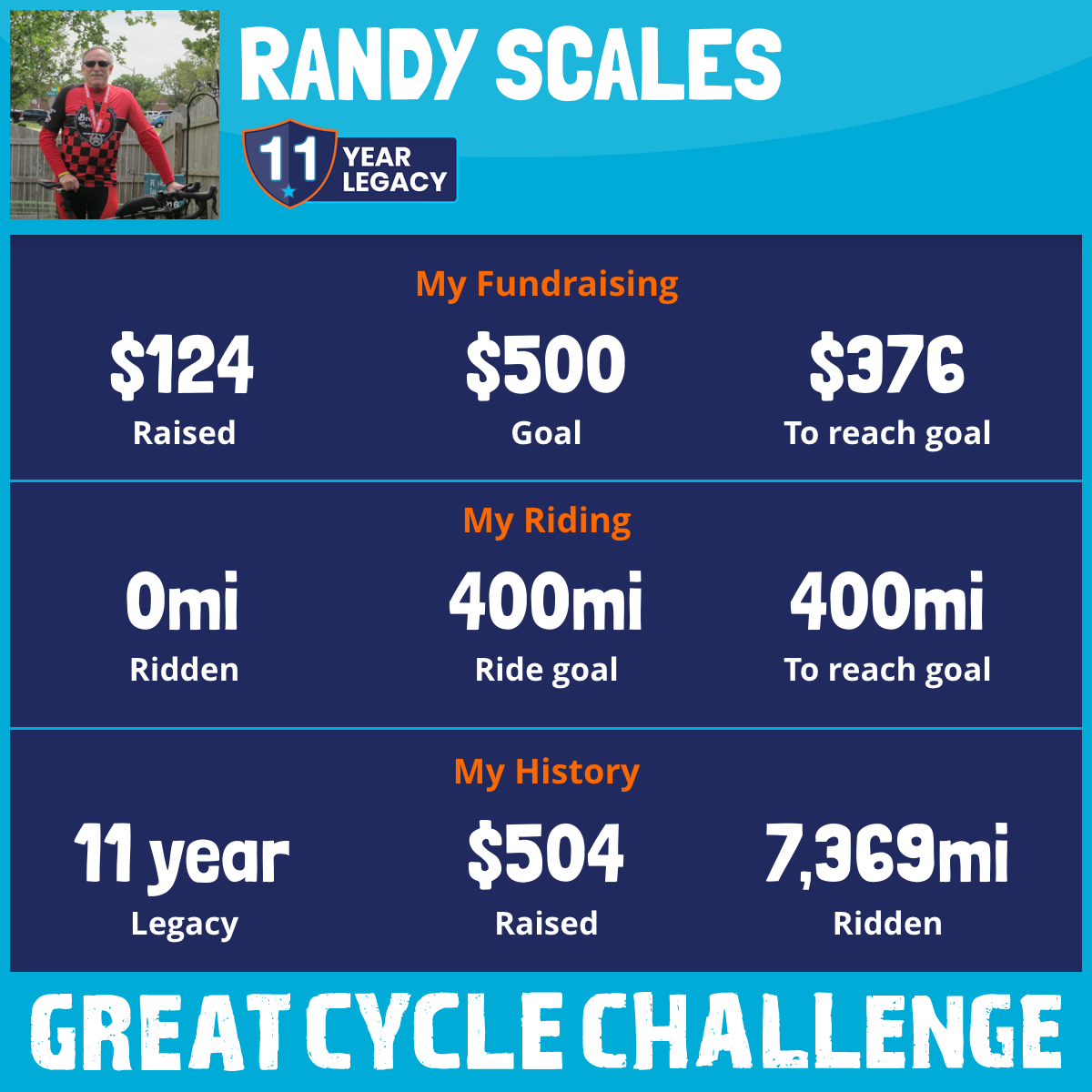 I am riding 400 mi in memory of John E Scales, Sr. Please sponsor me and support my challenge to fight kids' cancer and save little lives.