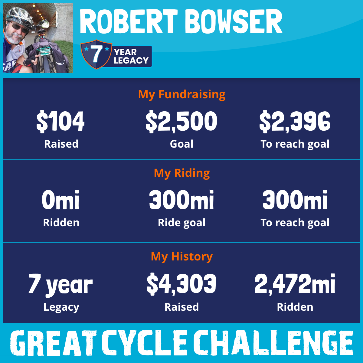 This September, I am taking part in the Great Cycle Challenge for the Seventh Year to fight kids' cancer! My ride goal to 300 miles and my donation goal to $2500. I can not wait for September when my miles will start counting on my GOAL of 300 miles!!!!