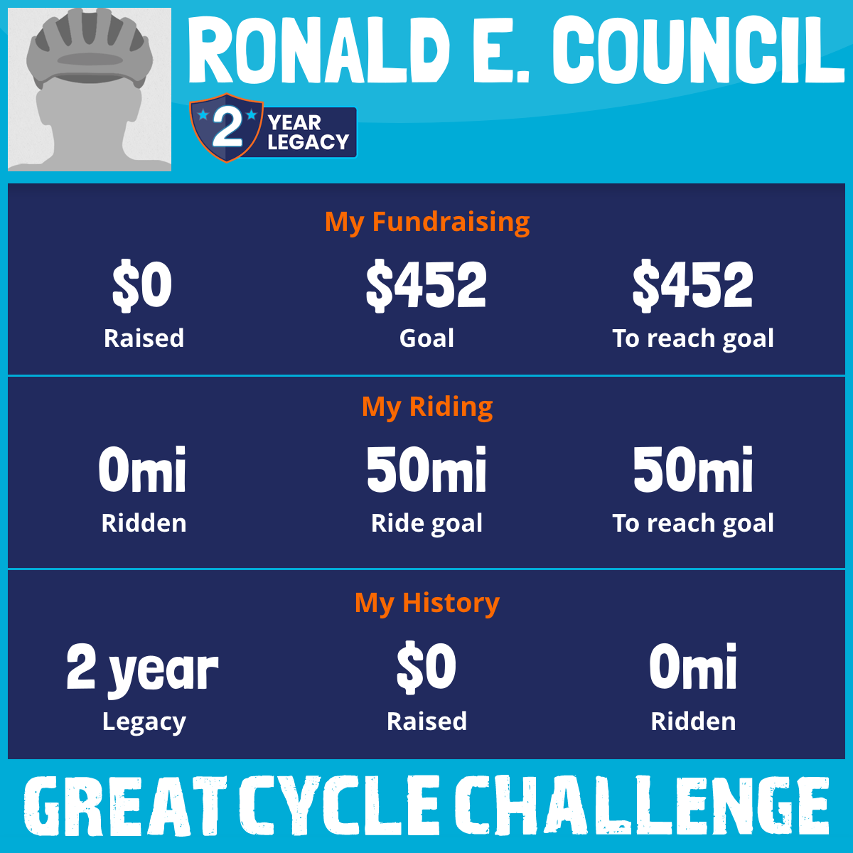 I am riding 50 mi in memory of Ronald E. Council. Please sponsor me and support my challenge to fight kids' cancer and save little lives.