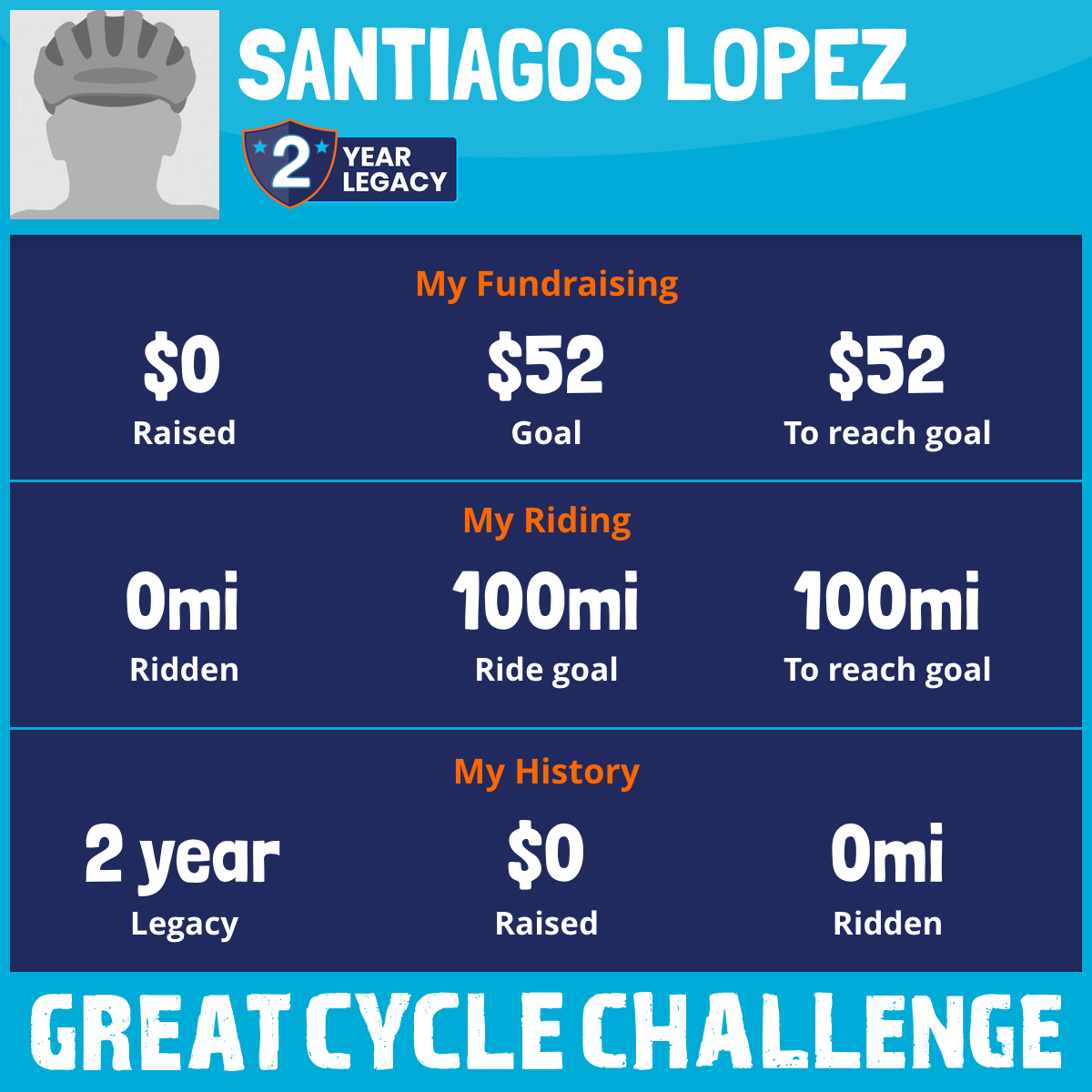 I am riding 100 mi for my daughter, Santiago55. Please sponsor me and support my challenge to fight kids' cancer and save little lives.