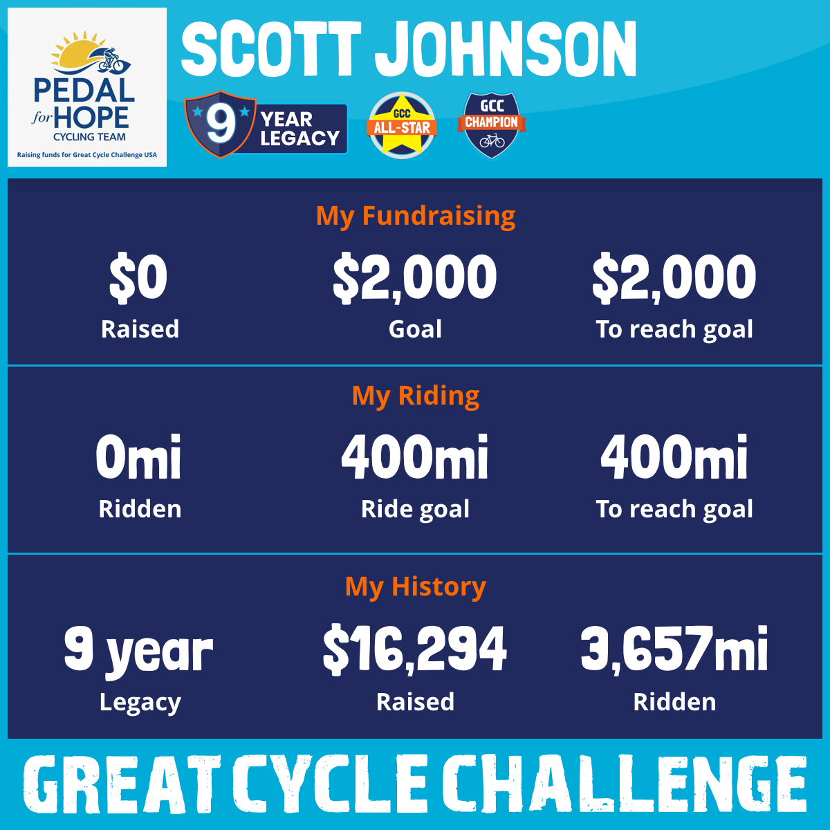 🚴♂️ Why I Ride: A Personal Challenge Turned Lifelong Mission Nine years ago, a friend challenged me to join the Great Cycle Challenge—and I accepted. What began as a simple dare has since transformed my life and deepened my commitment to fighting childhood cancer. Last year, my father was diagnosed with cancer. When it hits home, the reality of this disease becomes even more painful. It’s a reminder that cancer doesn’t discriminate—and no one should have to live fighting it. This year, I’m dedicating my ride to my dad and to every child battling this life-threatening illness. These kids deserve the freedom to play, laugh, and live fully—just as we enjoy the freedom to pedal. 💪 Join Me. Ride With Me. Make a Difference. If you have a bike—or have ever thought about getting one—this is your moment. Become part of a movement of everyday heroes who are changing lives one mile at a time. 👉 Click here to join or donate to my ride: https://greatcyclechallenge.com/Riders/ScottJohnson. I promise you won’t regret it. Let’s ride for hope, for healing, and for every child who deserves a future. #GCCUSA