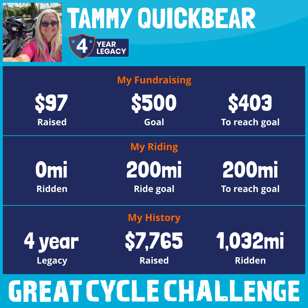 This September, I am taking part in the Great Cycle Challenge to fight kids' cancer! Due to medical reasons I am unable to ride unfortunately. I am still participating in other ways . I am walking and logging the miles I get in that way. I am under drs orders to not be to active. I might need a hysterectomy in the near future unless we figure something else out. I hope you can find it in your heart’s to donate.