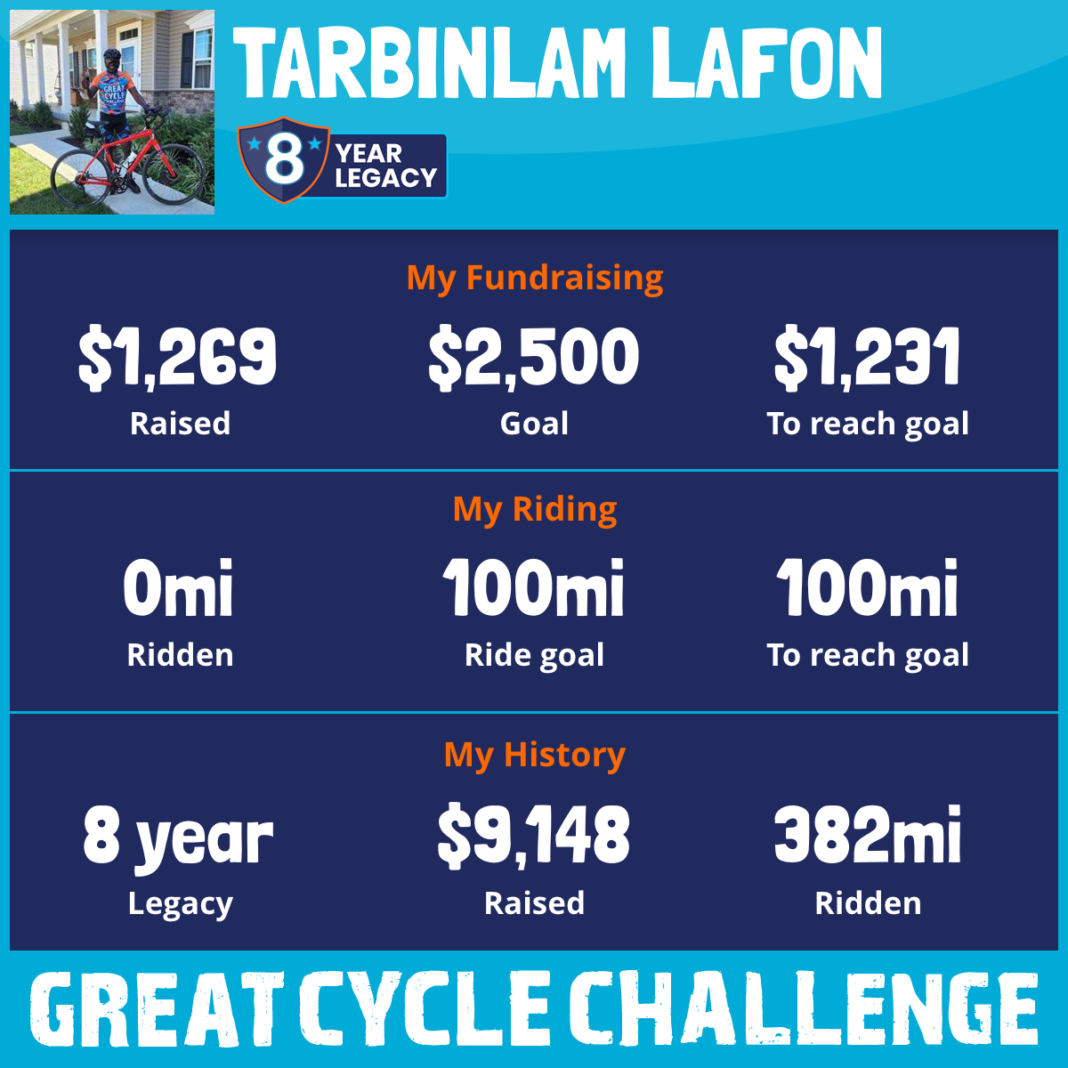 I am riding 100 mi in memory of For all the members of the Lafon, Nguni, Che and friends' families who've been affected by cancer. Please sponsor me and support my challenge to fight kids' cancer and save little lives.