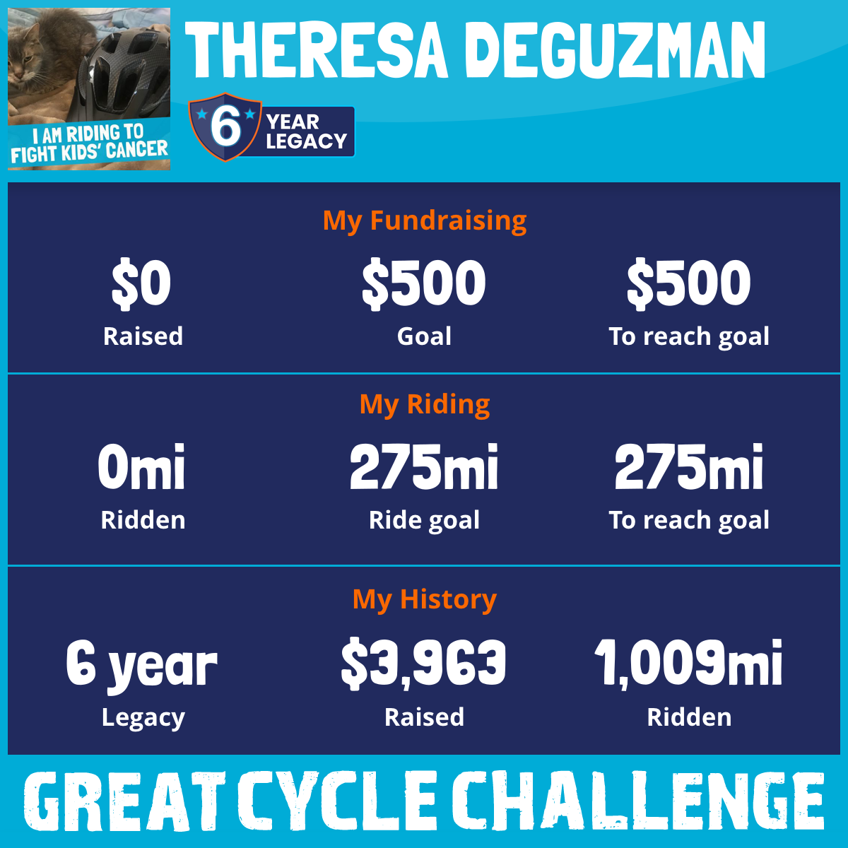 Although I got a late start and had to reduce my riding goal due to some minor issues, I am still committed to riding 200 miles this September for the cause. Please support me by making a donation to give these kids the brighter futures they deserve.