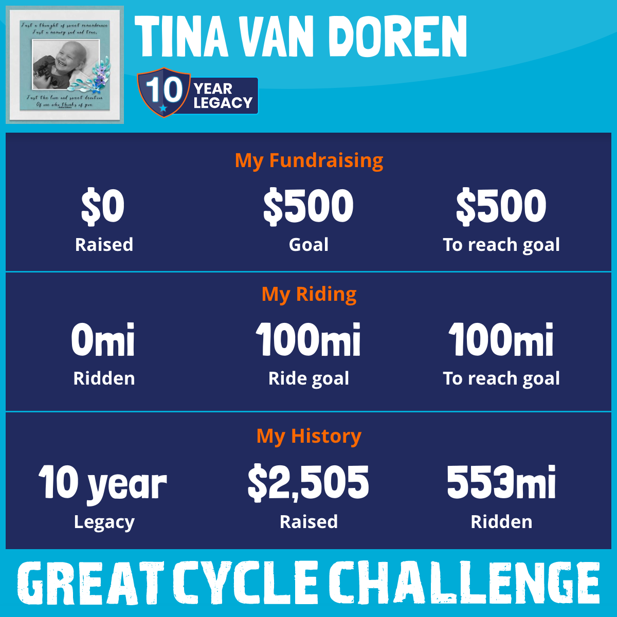 I am riding 100 mi in memory of Logan D Ressler Brown. Please sponsor me and support my challenge to fight kids' cancer and save little lives.