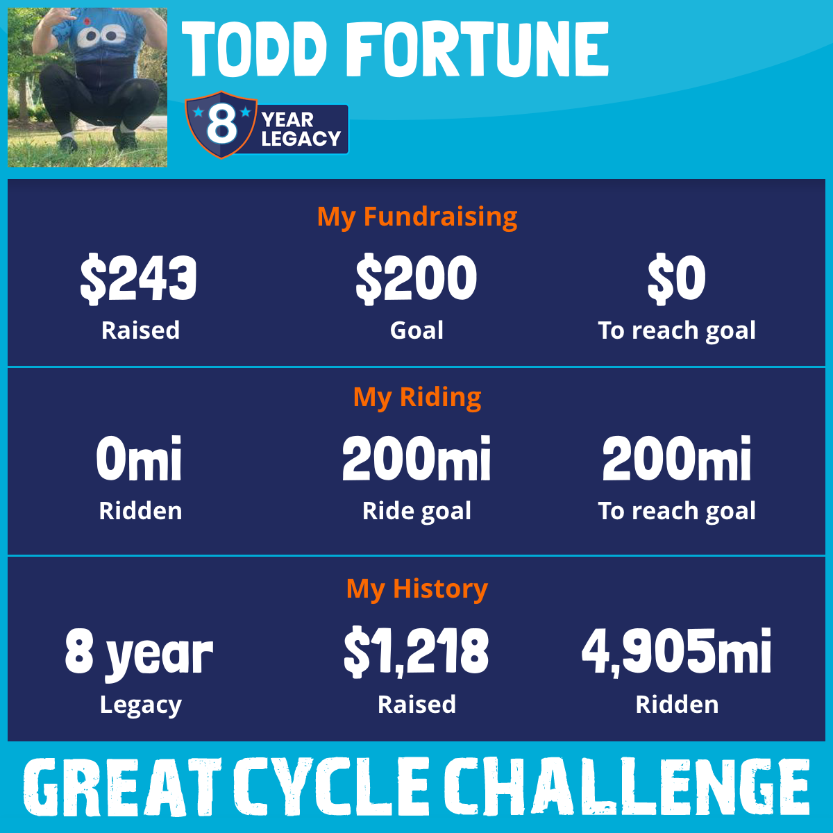 I am riding 200 mi in memory of my grandfather, Carl Frank Fortune. Please sponsor me and support my challenge to fight kids' cancer and save little lives.