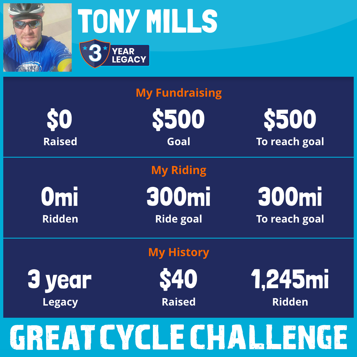 I am riding 300 mi for Tonny mills. Please sponsor me and support my challenge to fight kids' cancer and save little lives.