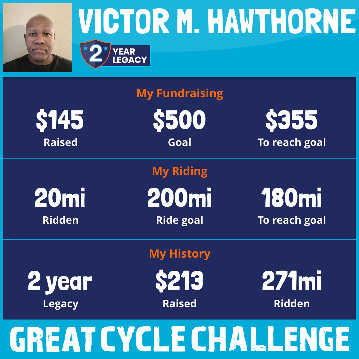 15 Sep 2025After not participating in a few years, I figured it was time to get back on my bike. I had not ridden in over two years so I had to take baby steps and days off before going consistently. Fighting kids’ cancer is a great cause to jump start my rides through the Great Cycle Challenge. I rode my first 15 miles this morning for my 8th ride and I feel good. The plan is to be at 20 miles in the next two weeks.