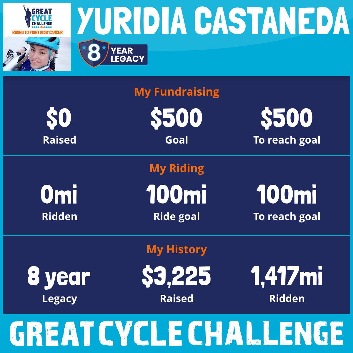 I am riding 100 mi in memory of Ruth. Please sponsor me and support my challenge to fight kids' cancer and save little lives.