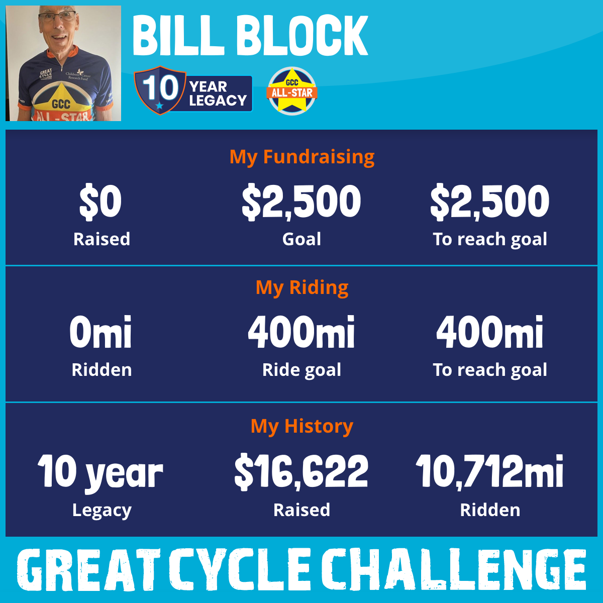 This September for the10th year in a row, I am taking part in the Great Cycle Challenge to fight kids' cancer!