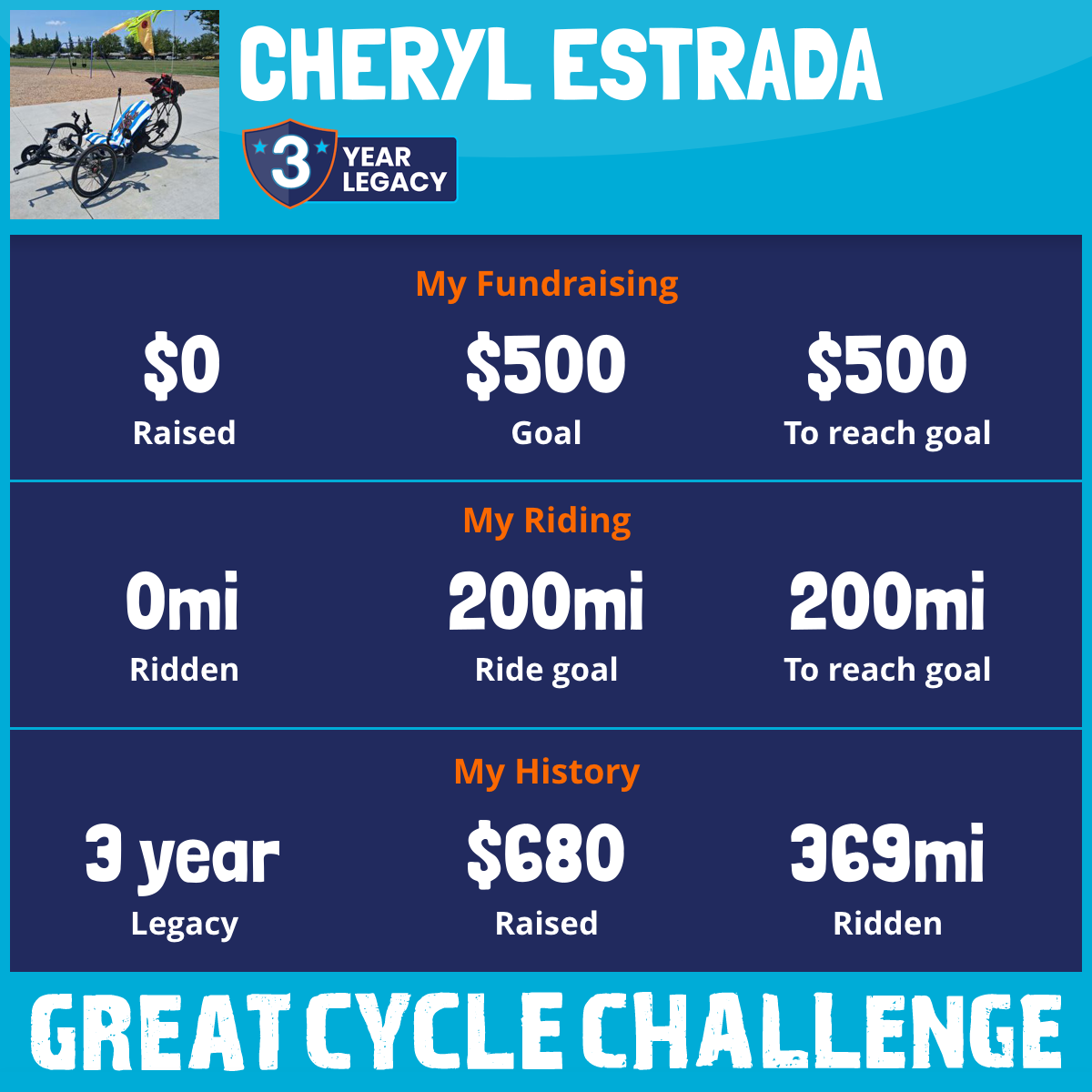 You funny thing about this ride is that I'm a trike rider it is Maverick G.T. 18 and most if not all trike ride we love riding them just wait to saddle up set back and take off for a few mile to 20, 20 or even 40 miles. Most if not all trike riders are retired so we have the time and the desire to saddle up. I'm retired Military and former OTR Caring for my spouse recovering fro a stroke so my time is dealt out to me by the hours so if I could get six hour to ride I'm going to make the best of it. So is I could help other (Kids with Cancer) and do something I love do I will. I've promised Great Cycle Challenge first 100 miles then 150 which I made 165miles with a $500. donation well I fail short on the donation can you help me help the kids thank you again.